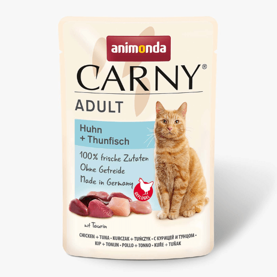 Animonda Carny Adult Kana &Tonnikala 85g on laadukkaista lihaisista raaka-aineista valmistettu kissan märkäruoka, joka tarjoaa tasapainoisen, herkullisen ja terveellisen ravinnon täysikasvuisille kissoille. Tämä laadukas kissan täysravinto on täysin viljaton, sokeriton, soijaton ja säilöntäaineeton. Se on hyvin siedetty ja erinomaisesti sulava, joten se on ihanteellinen ravinto myös ruoka-ainetoleransseista tai allergioista kärsiville kissoille.