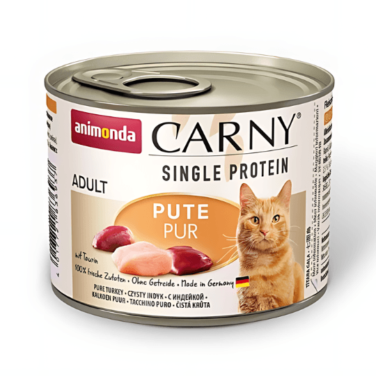 Animonda Carny Single Protein Kalkkuna 200g on upean makuinen yhden proteiinin kissanruoka, jossa on vain yksi eläinproteiinin lähde; kalkkuna. Monoproteiinisena kissanruokana tuote on erinomainen valinta ravintoaineyliherkkyyksistä kärsiville ja allergisille kissoille. Mikäli kissa sietää kalkkunaa, tämä tuote on turvallinen valinta. Reseptin täydentää rypsiöljy luonnollisena omega-3-rasvahappojen lähteenä. Carny Adult Single Protein Kalkkuna sopii erinomaisesti 1-6-vuotiaiden kissojen ruokintaan.